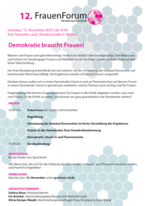 Darüber hinaus wollen wir in einem Demokratie-Check in und an Thementischen auf diesem Forum in einem Demokratie-Check-in gemeinsam erarbeiten, welche Themen noch wichtig sind für Frauen.