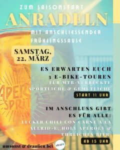 Zum Saisonstart machen wir ein großes Anradeln bei allrid-E – mit 3 geführten E-Bike-Touren und anschließender Frühlingssause!