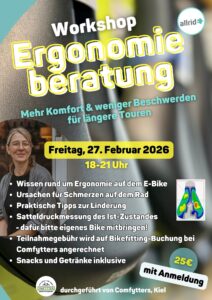 In einem kurzweiligen Workshop gibt Mirka Grundlagen ihres Ergonomiewissens an uns weiter, berät zu Schmerzursachen, gibt Tipps zur Linderung und macht eine erste Satteldruckmessung (hierfür bitte das Rad mitbringen).