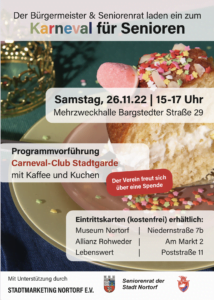 Der Bürgermeister lädt ein: Programm und Bewirtung mit Kaffee und Kuchen durch den Carneval-Club Stadtgarde und den Seniorenrat.