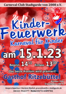 Am 21.01.2024 feiern auch die kleinen Karneval im Gasthaus Ritzebüttel. Dort gibt es ein Programm extra für Kids. Aufführungen, Spiele und Mitmachaktionen, werden Sie dann erleben. Es geht um 14:11 Uhr los.