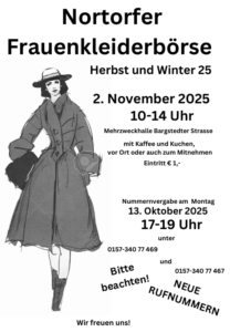 Am Sonntag, den 02. November 2025 findet wieder die Nortorfer Frauenkleiderbörse statt. Von 10 – 14 Uhr kann man in der Mehrzweckhalle Bargstedter Strasse nachhaltig nach einem neuen Outfit für Herbst und Winter suchen. Zur Stärkung gibt es Kaffee und Kuchen vor Ort oder auch zum Mitnehmen.